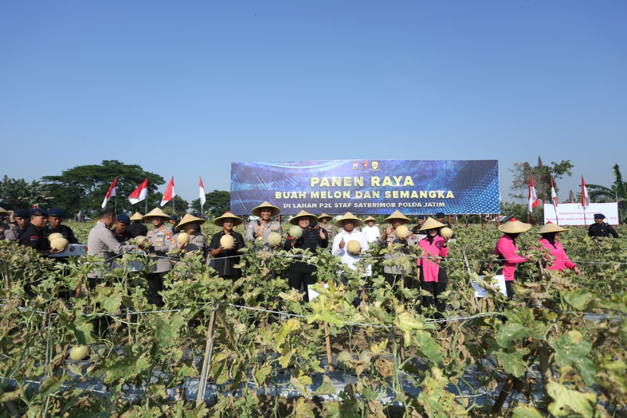 SIDOARJO – Satuan Brimob Polda Jawa Timur menggelar panen raya buah melon dan semangka di Kesatrian Guruh Arif Darmawan, Mako Kompi 4 Yon D Pelopor, Sidoarjo pada Selasa (23/9/2025).