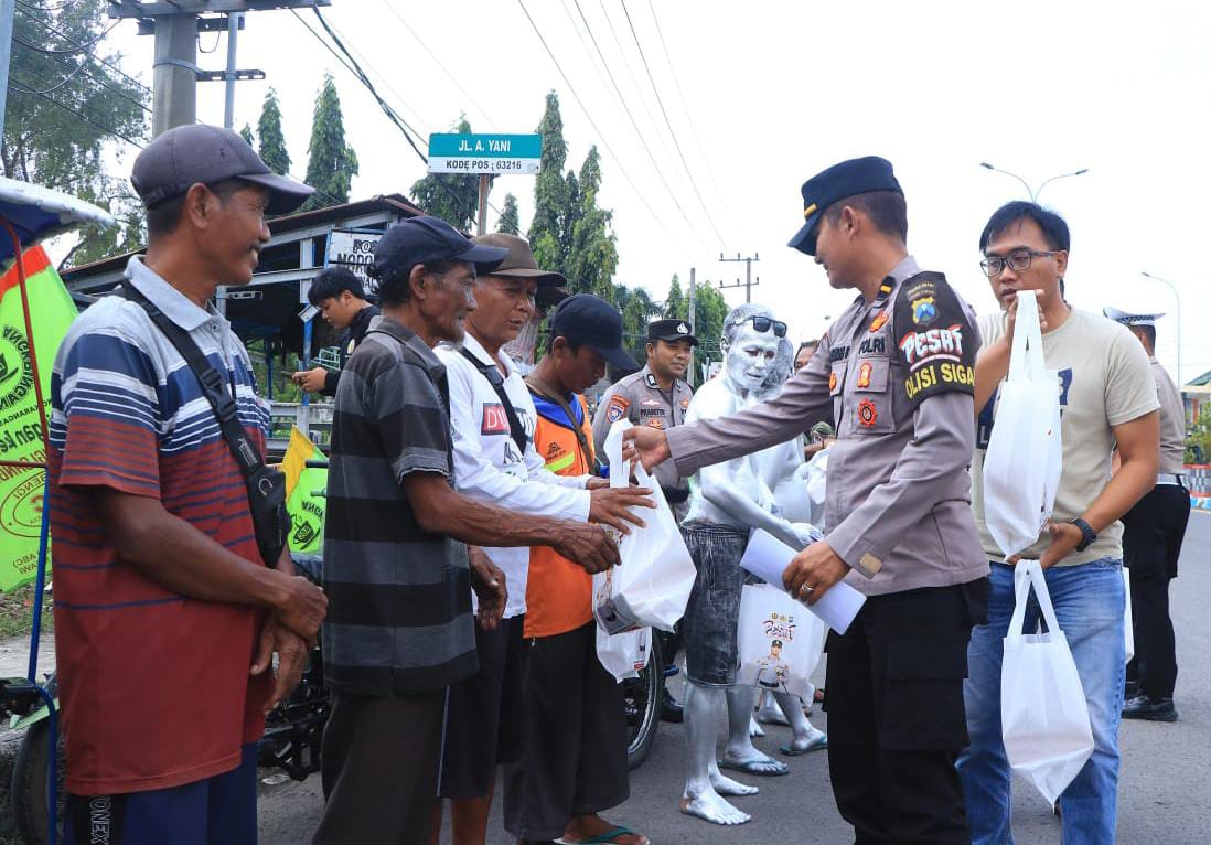 Sambil memberikan pesan Kamtibmas, para anggota Polres Ngawi Polda Jatim itu berbagi puluhan paket sembako kepada tukang becak, manusia silver, jukir, petugas kebersihan dan warga kurang mampu yang melintas di lokasi kegiatan terutama untuk masyarakat pekerja jalanan.