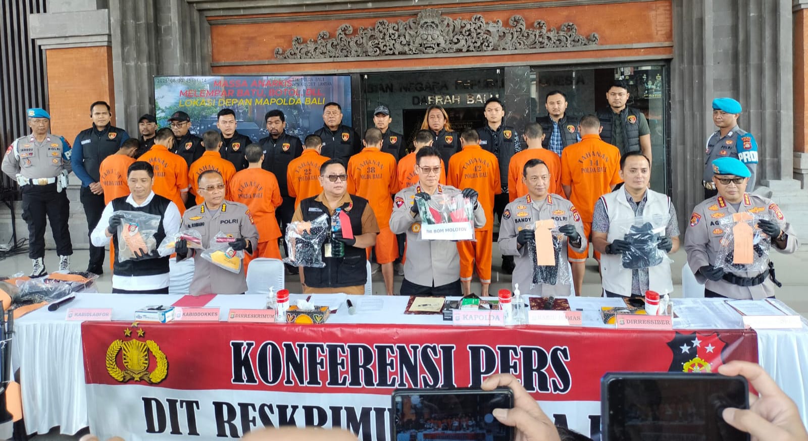 Para tersangka diduga terlibat pengerusakan kantor Mapolda Bali dan Ditreskrimsus Polda Bali, perusakan kendaraan dinas Polri milik Sat Samapta Polresta Denpasar, hingga penjarahan isi randis Polri berupa peralatan pengendalian massa (PHH) serta pengambilan amunisi gas air mata. Polisi juga menemukan barang bukti berupa bahan bakar Pertalite dan bom molotov yang rencananya akan digunakan saat aksi berlangsung.