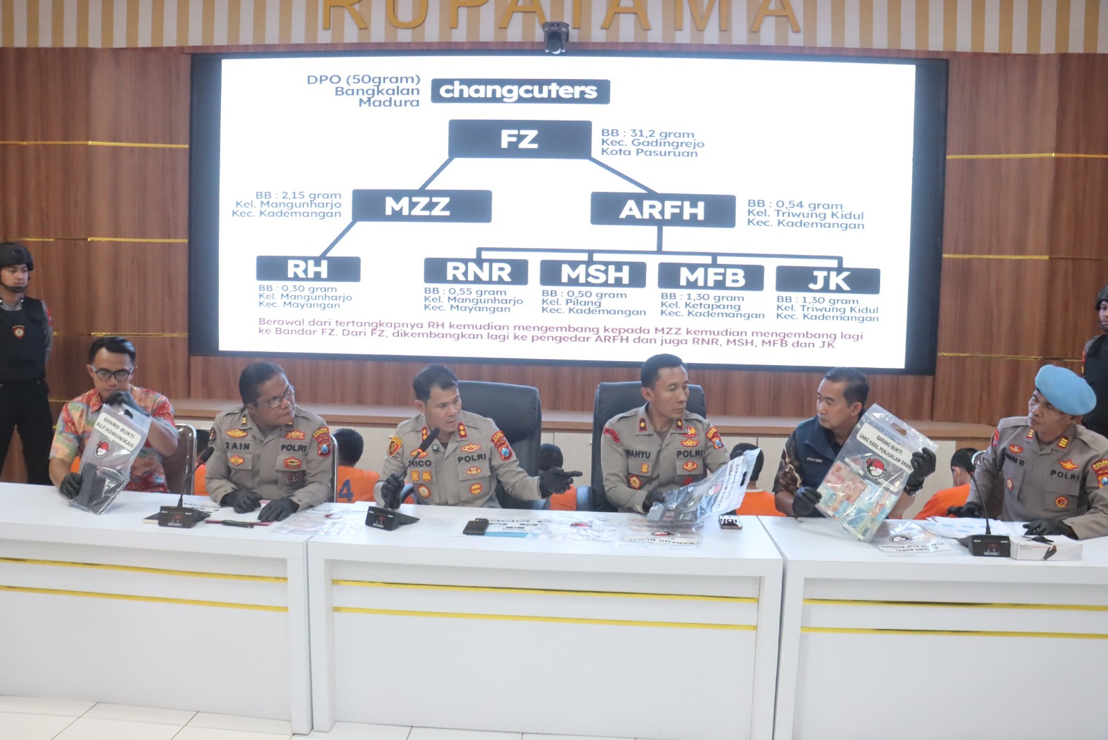 Kapolres Probolinggo Kota mengungkapkan, terkait dengan 8 orang tersangka yang merupakan 1 jaringan, bandarnya adalah tersangka FZ yang diamankan di Kota Pasuruan.