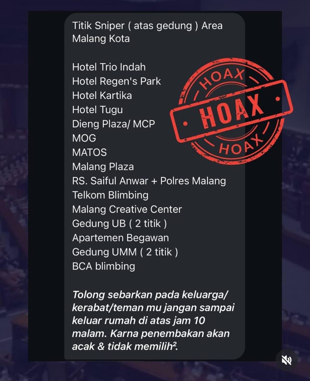 Dalam pesan yang beredar diawali dengan kalimat ‘Titik Sniper (atas gedung) Area Malang Kota’.