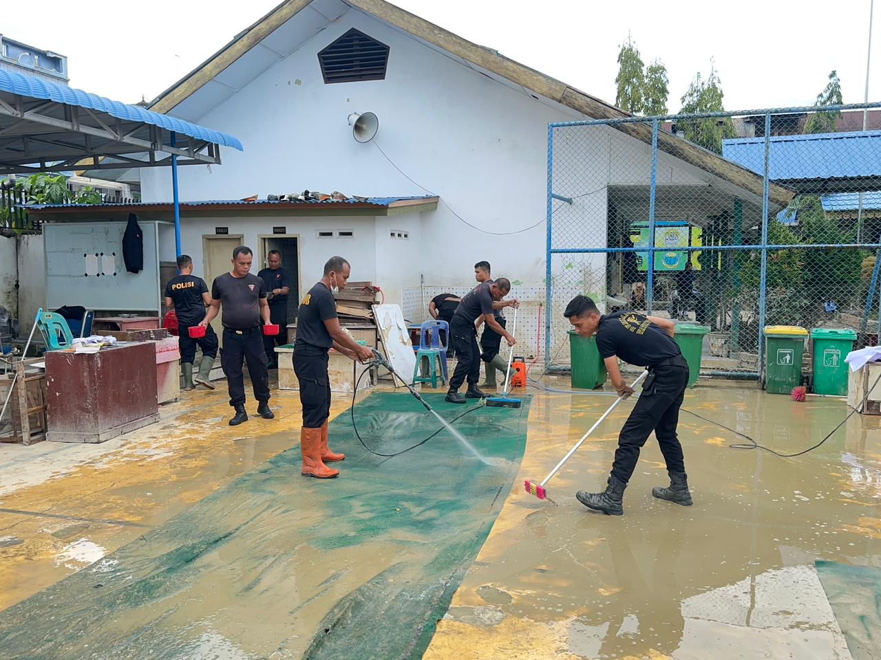 LANGKAT — Personel Satuan Brimob Polda Sumatera Utara melaksanakan kegiatan pembersihan lingkungan sekolah yang terdampak banjir di SMA Negeri 1 Tanjung Pura, Kabupaten Langkat, Minggu (28/12/2025).