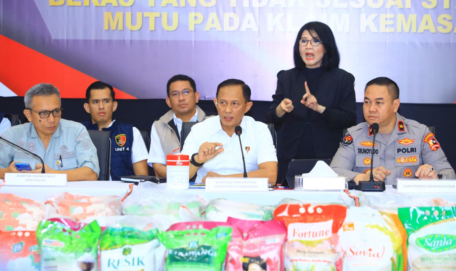 JAKARTA – Kepolisian Republik Indonesia melalui Satgas Pangan Polri menggelar konferensi pers terkait pengungkapan kasus penjualan beras bermerek yang tidak sesuai dengan standar mutu. Acara ini dibuka oleh Karopenmas Divhumas Polri Brigjen Pol. Trunoyudo Wisnu Andiko, S.I.K., dan dipimpin langsung oleh Direktur Tindak Pidana Ekonomi dan Khusus (Dirtipideksus) Bareskrim Polri, Brigjen Pol. Helfi Assegaf, S.I.K., M.H. selaku Kepala Satgas Pangan Polri.